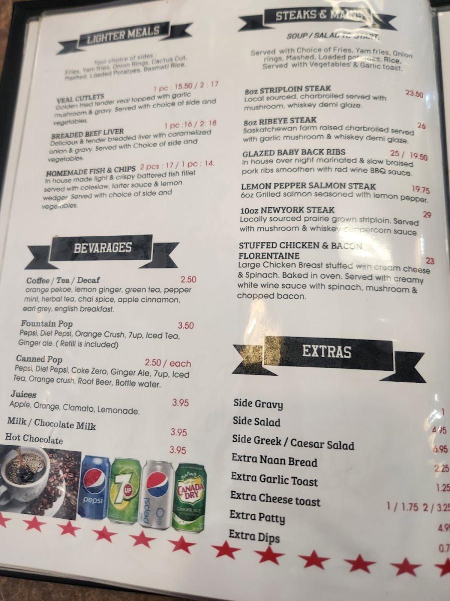 The menu highlights include hearty options like the Butter Chicken Bowl and the Butter Chicken Poutine, as well as comforting dishes such as Steak and Tortellini Stroganoff. These choices pair well with fresh starters like Mushroom Soup or a crisp Garden Salad, making each meal feel satisfying without being overly complex.
